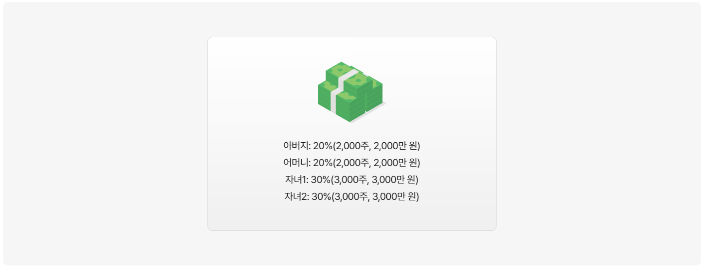 ② 부모는 각 1억 원, 자녀들은 각 1억 5,000만 원을 배당 받습니다.